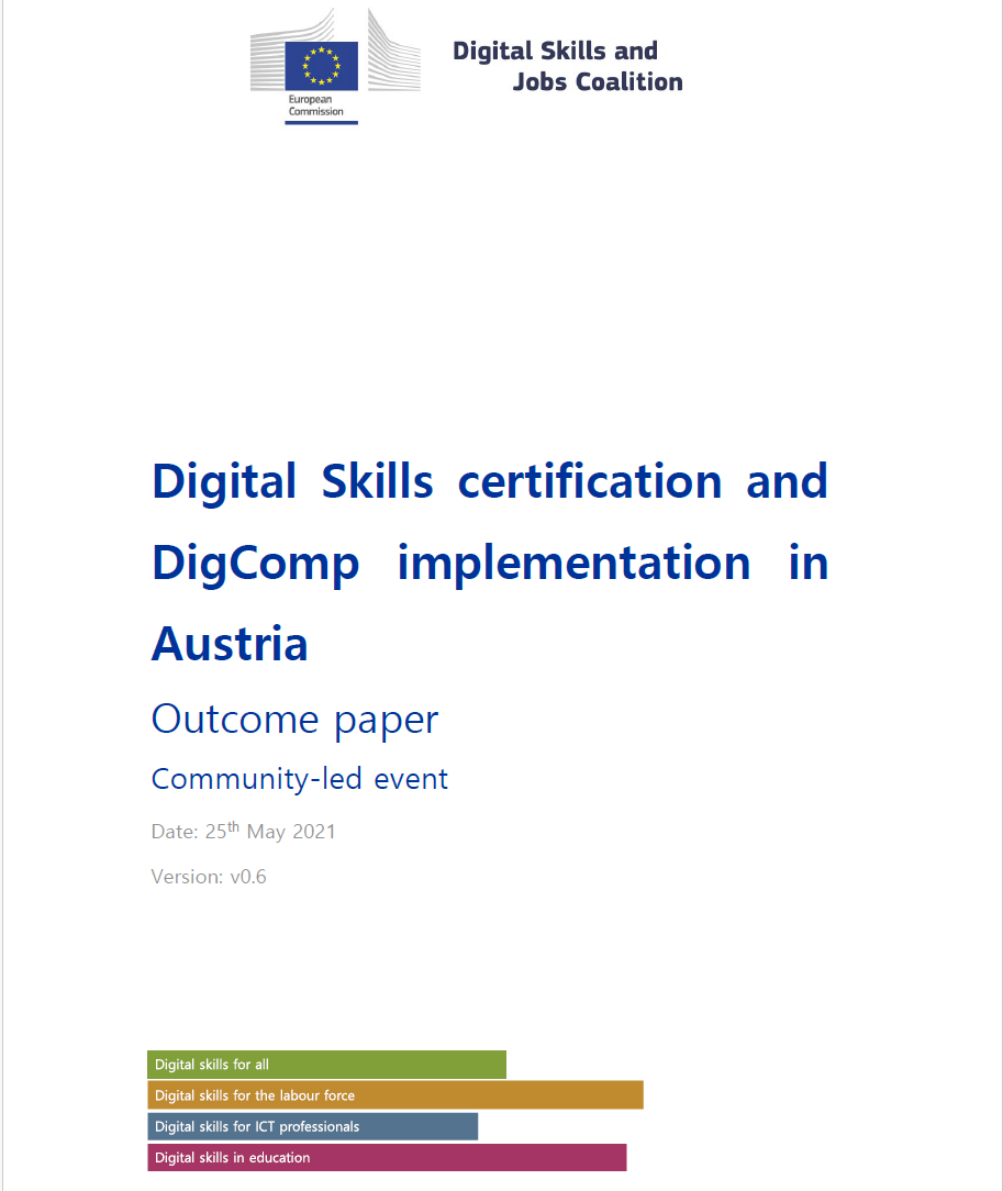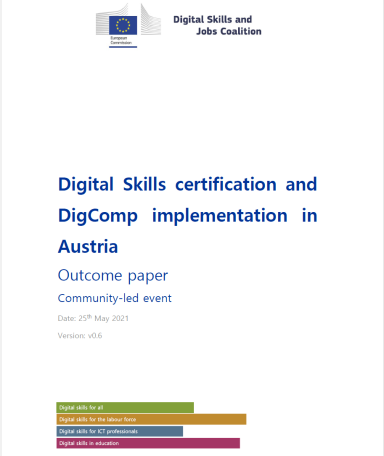 "Digital Skills certification and DigComp implementation in Austria" der Digital Skills and Job Coalition (DSJC) der Euro-päischen Komission in Öster-reich mit HBM Martin Kocher und FBM Margarete Schram-böck sind nach wie vor wegweisend für die Digital Skills Entwicklungen.